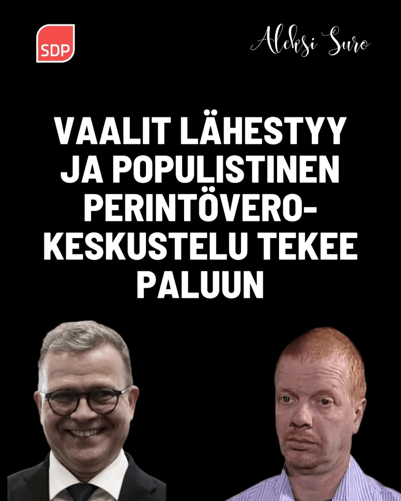 Perjantaina uutisoitiin, että Kokoomus haluaa poistaa kehysriihessä perintö- ja lahjaveron. Perussuomalaiset tyrmäsivät tämän heti alkuun, mutta eiköhän vaihtokauppaa jälleen saada käytyä. Jos ei vaihturia muualta löydy, yhteinen nimittäjä muodostunee hallituspuolueiden välille jälleen kehitysavun leikkauksista tai kireämmästä maahanmuuttopolitiikasta. Verouudistusta kaavaillaan jopa tehottoman yhteisöveron alennuksen tilalle, sillä tällä tehdään taas pysyvämpi lovi valtion kassaan – ja mikä tärkeintä, tästä on vaikeampi seuraavan hallituksen pakittaa.